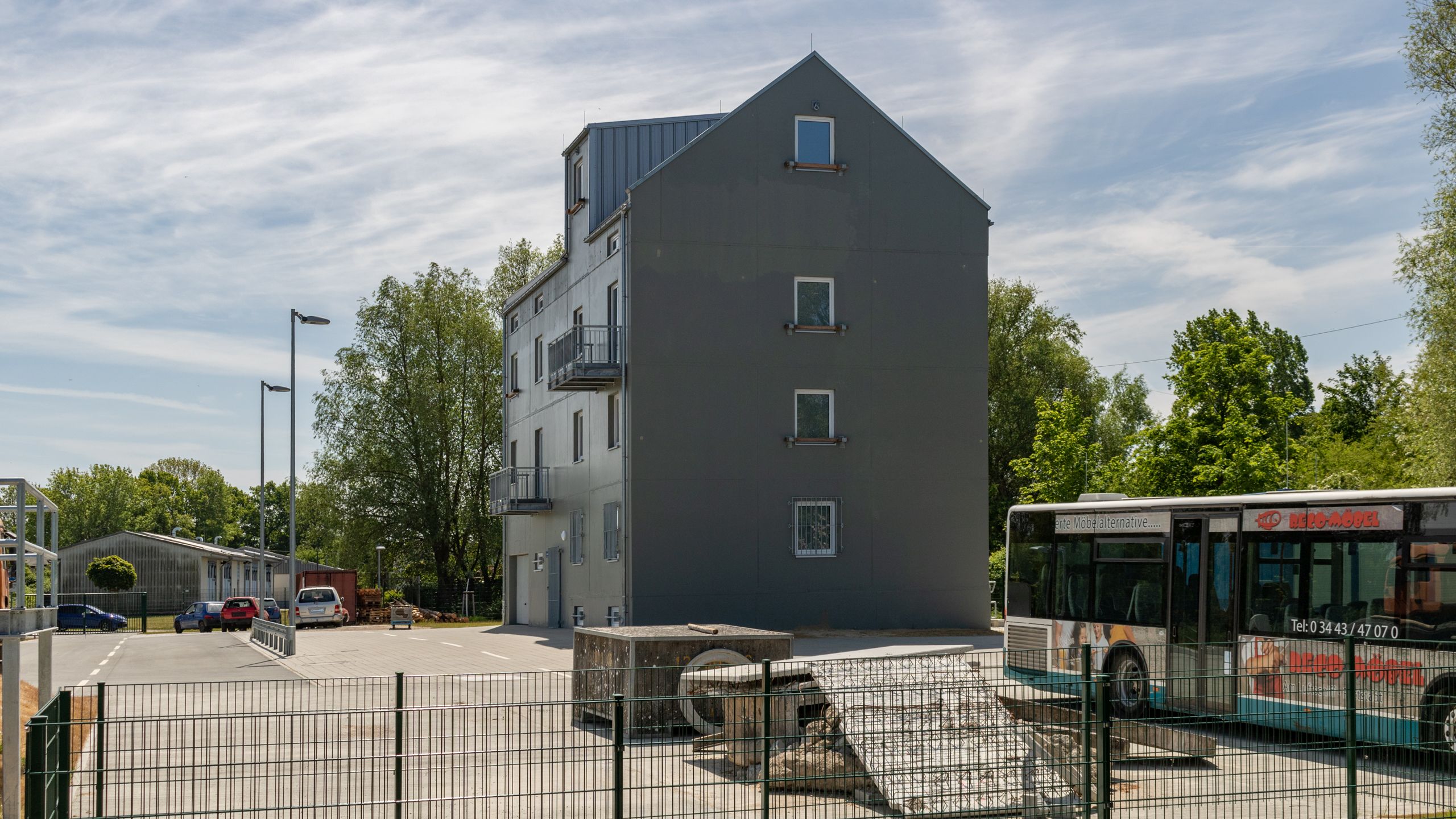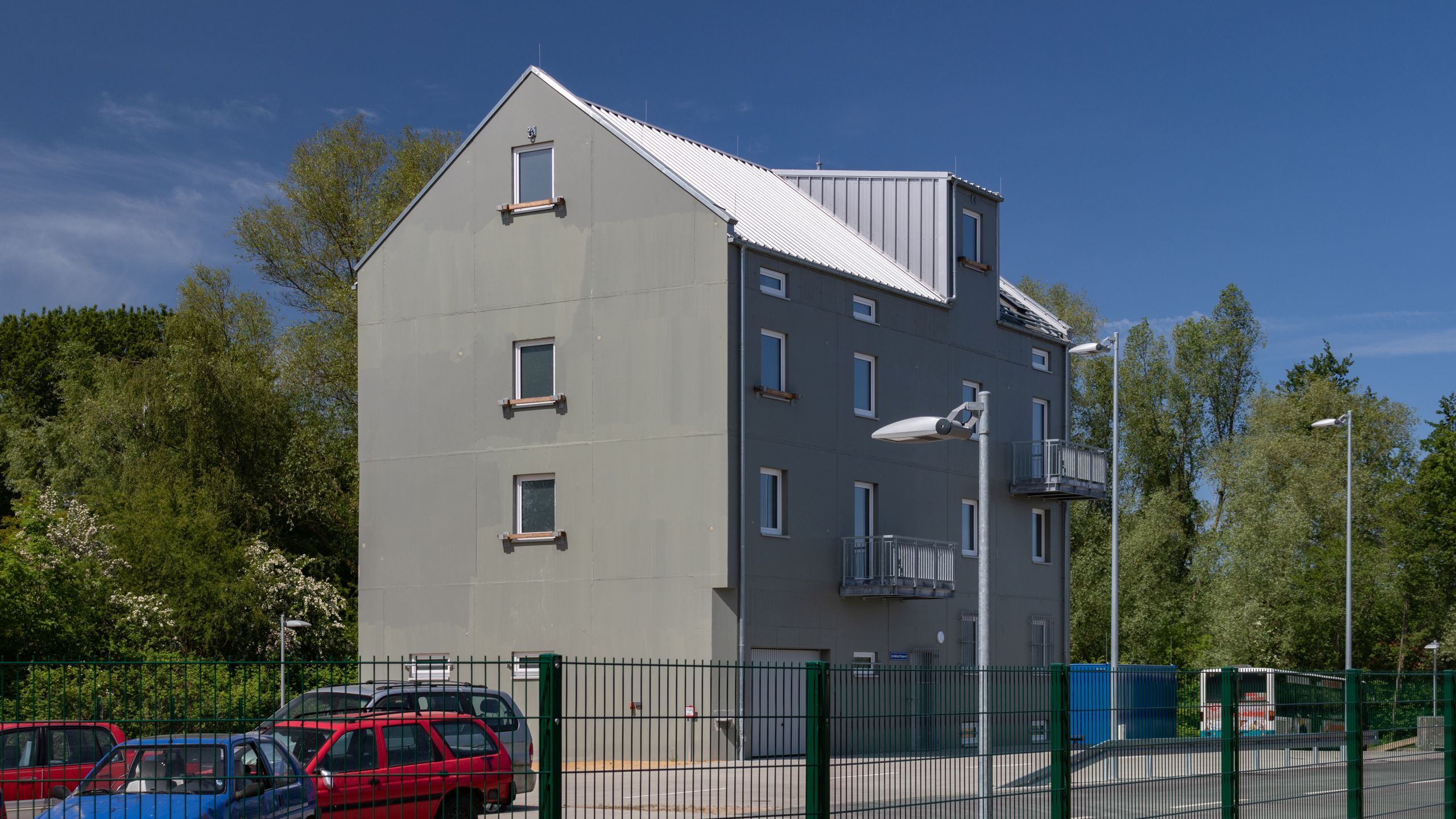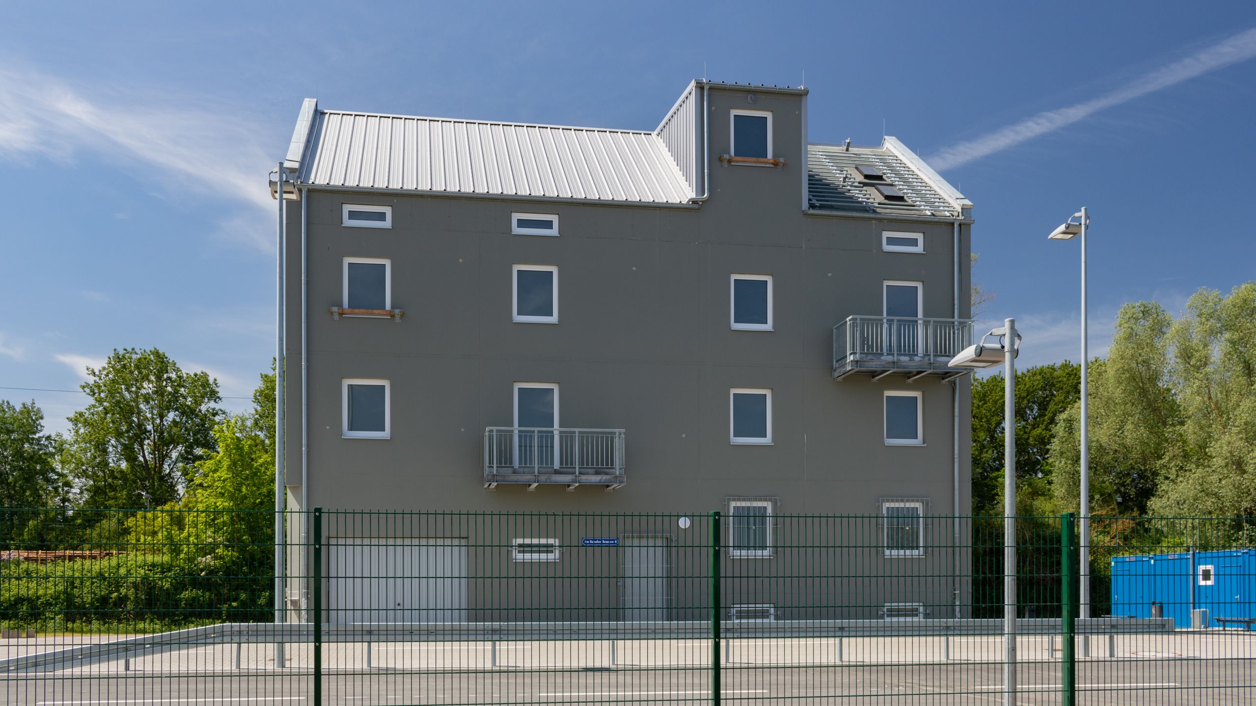 An den Fassadenflächen befinden sich verschiedene Anleiterpunkte, Balkone und Stahlösen zum abseilen.