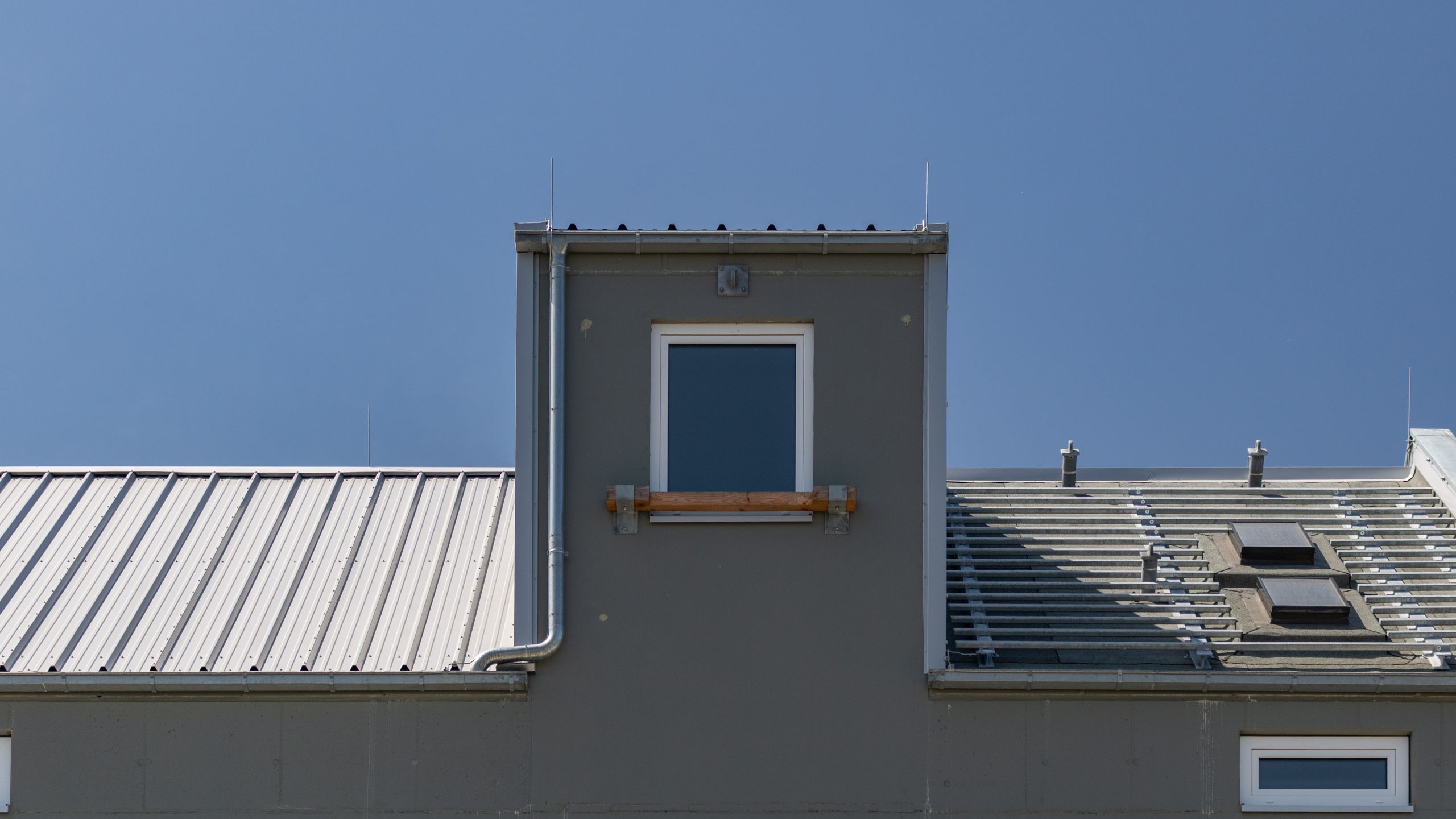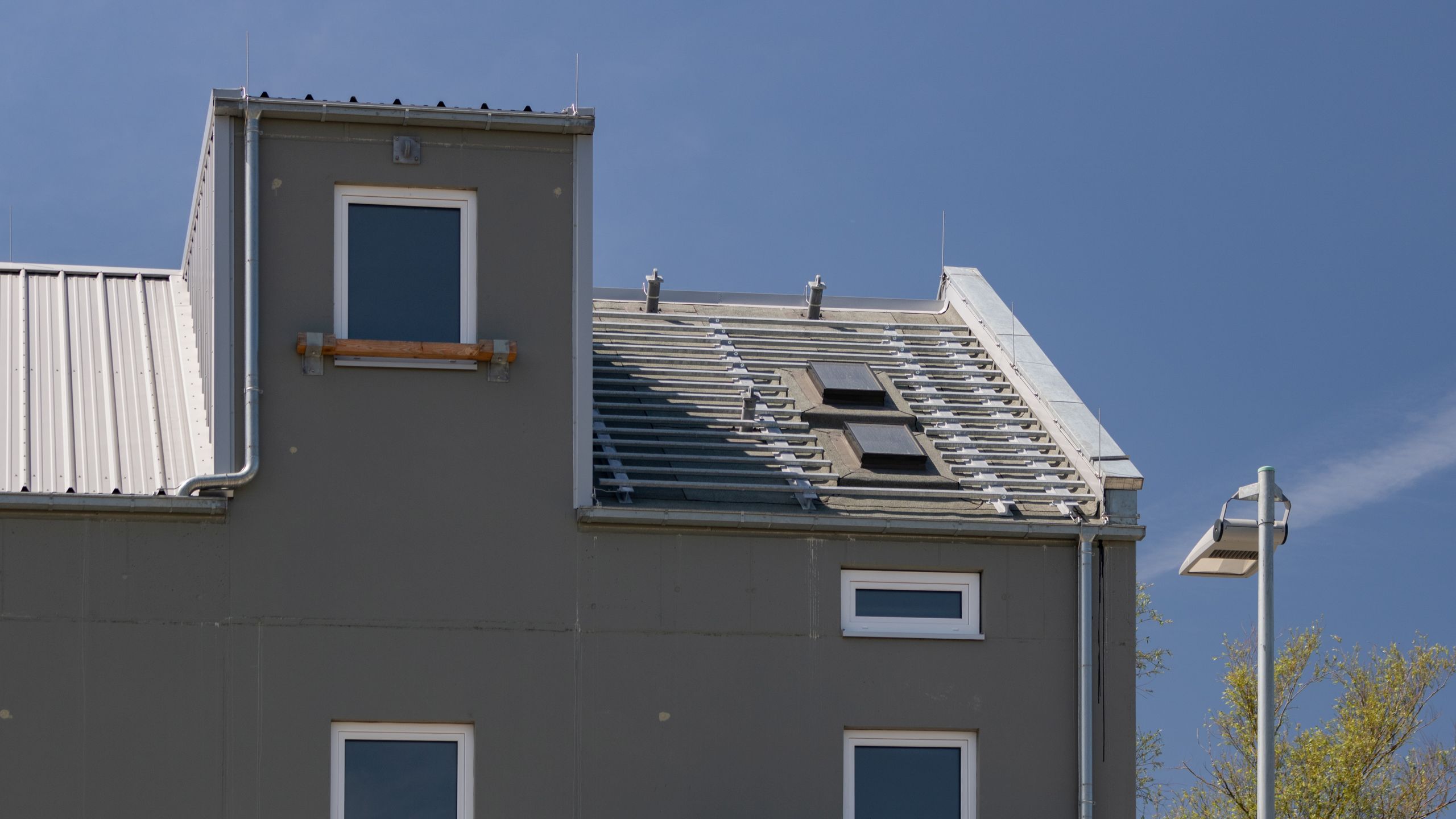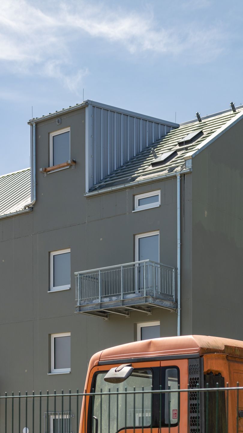 Den oberen Abschluss bildet ein als Übungsdach ausgebildetes Satteldach mit einer Gaube und Dachfenstern.